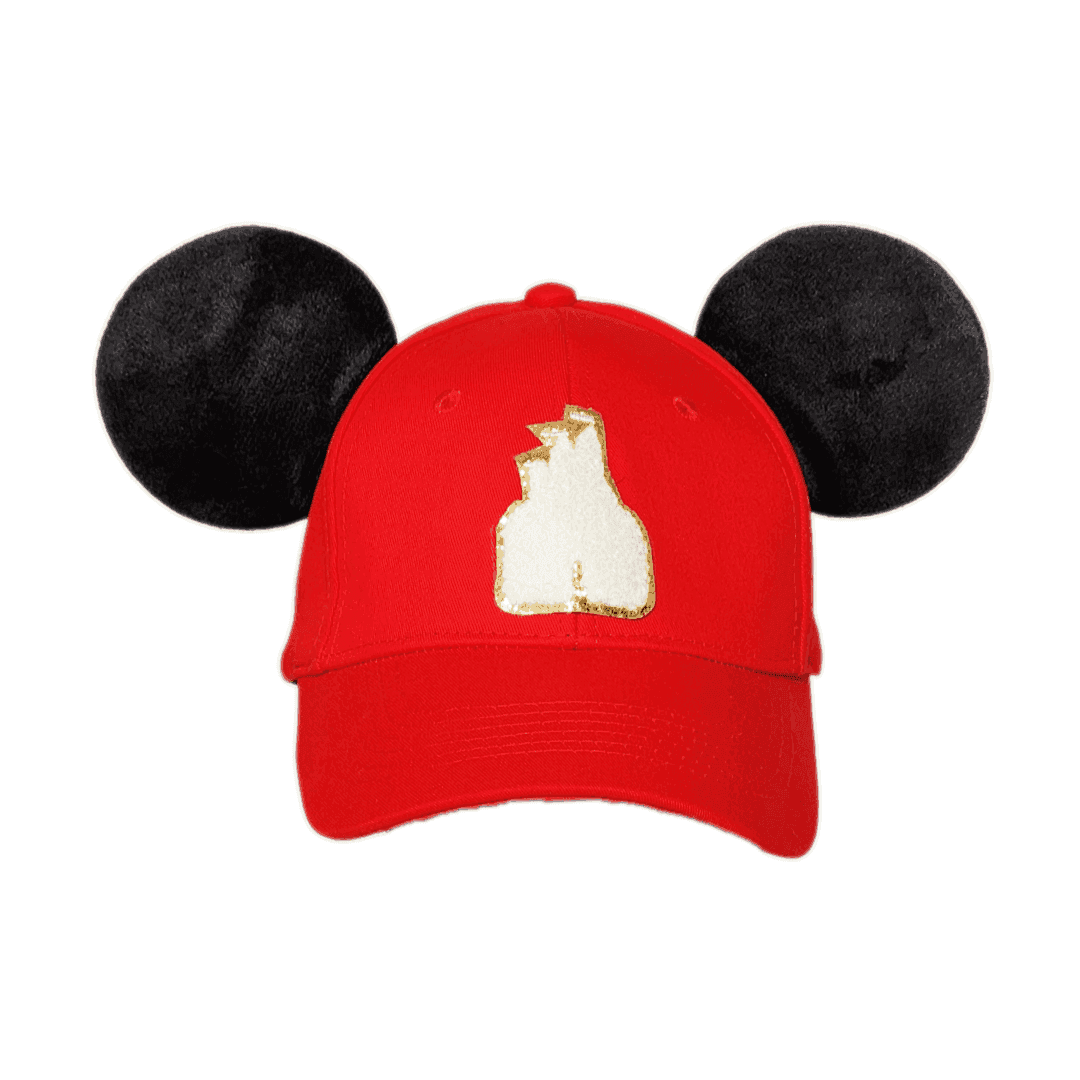 Our Castle Dreams Holiday mouse ear hat is perfect for a day spent in the Disney parks or out around town. This hat is made of 100% high quality cotton to be both lightweight and durable. It features a white fuzzy chenille castle patch, and two premium black mouse ears made to stand up... even on the wildest rides!