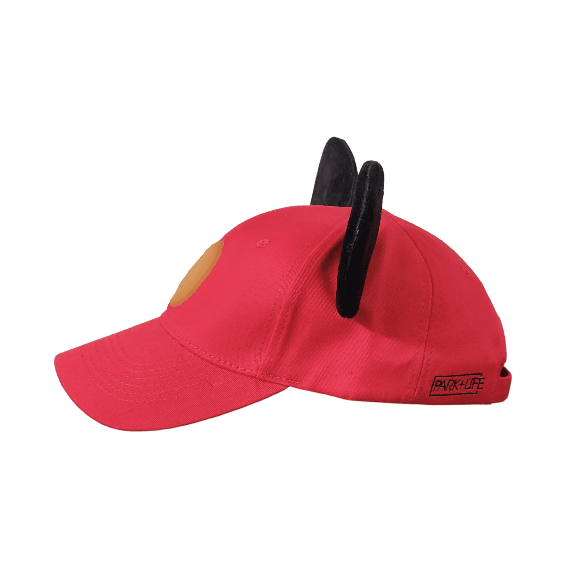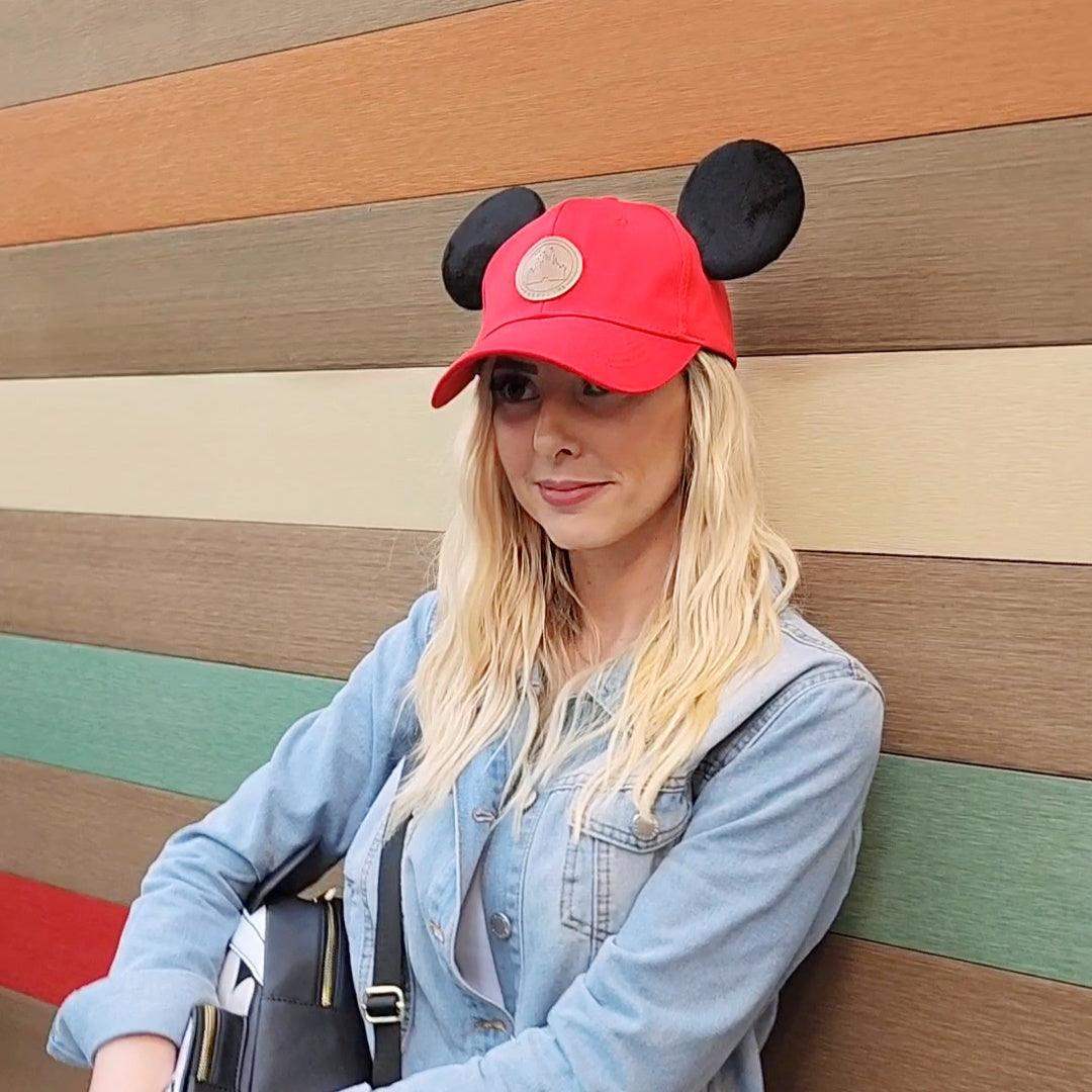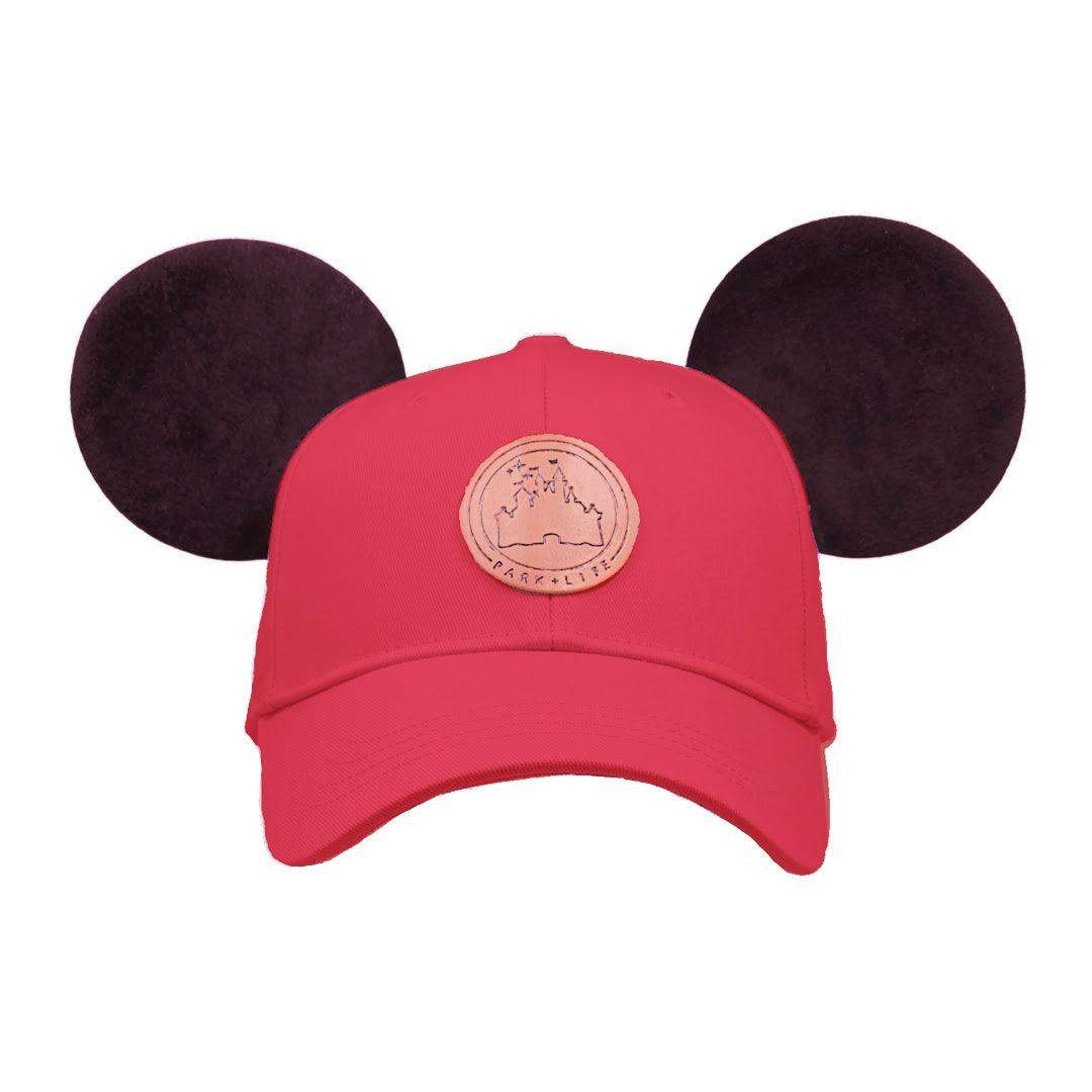 Our True Original classic style mouse ear hat is perfect for a day spent in the Disney parks or out around town. This hat is made of 100% high quality cotton to be both lightweight and durable. It features a vegan leather "Park+Life" castle logo patch, and two premium black mouse ears made to stand up... even on the wildest rides!