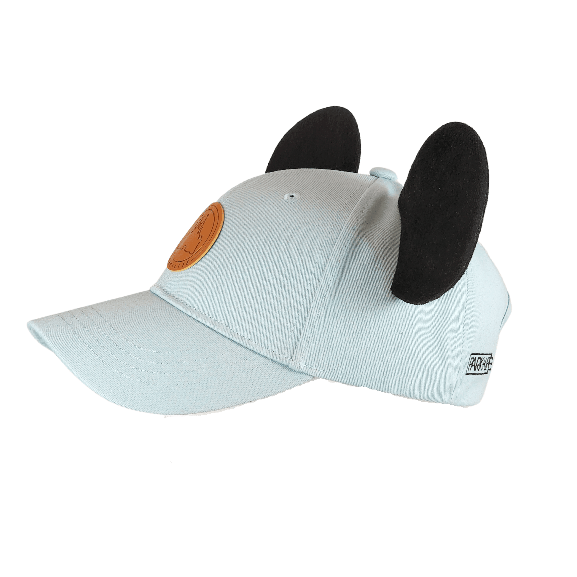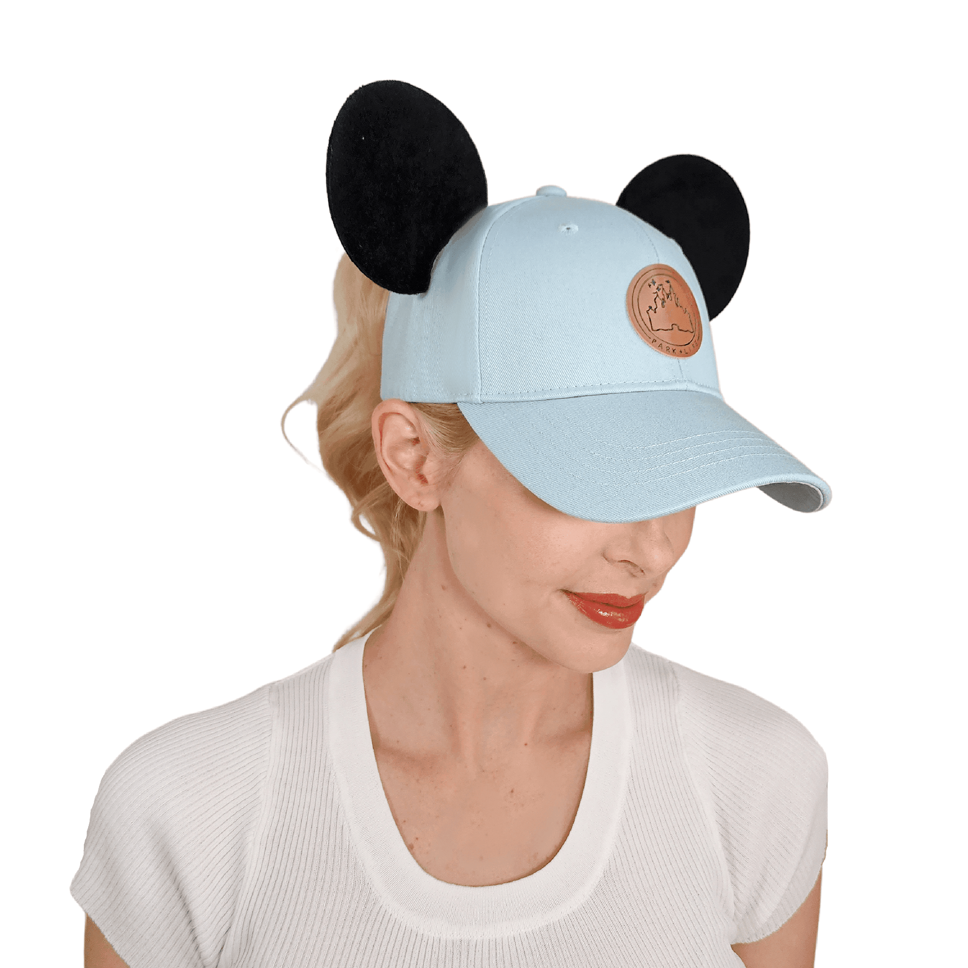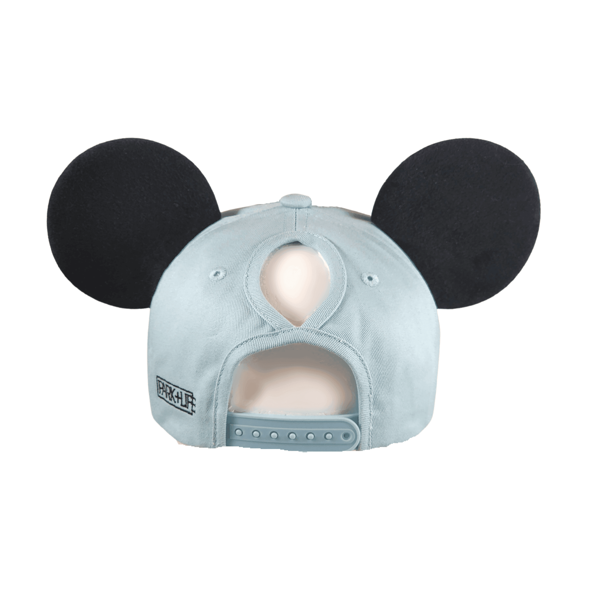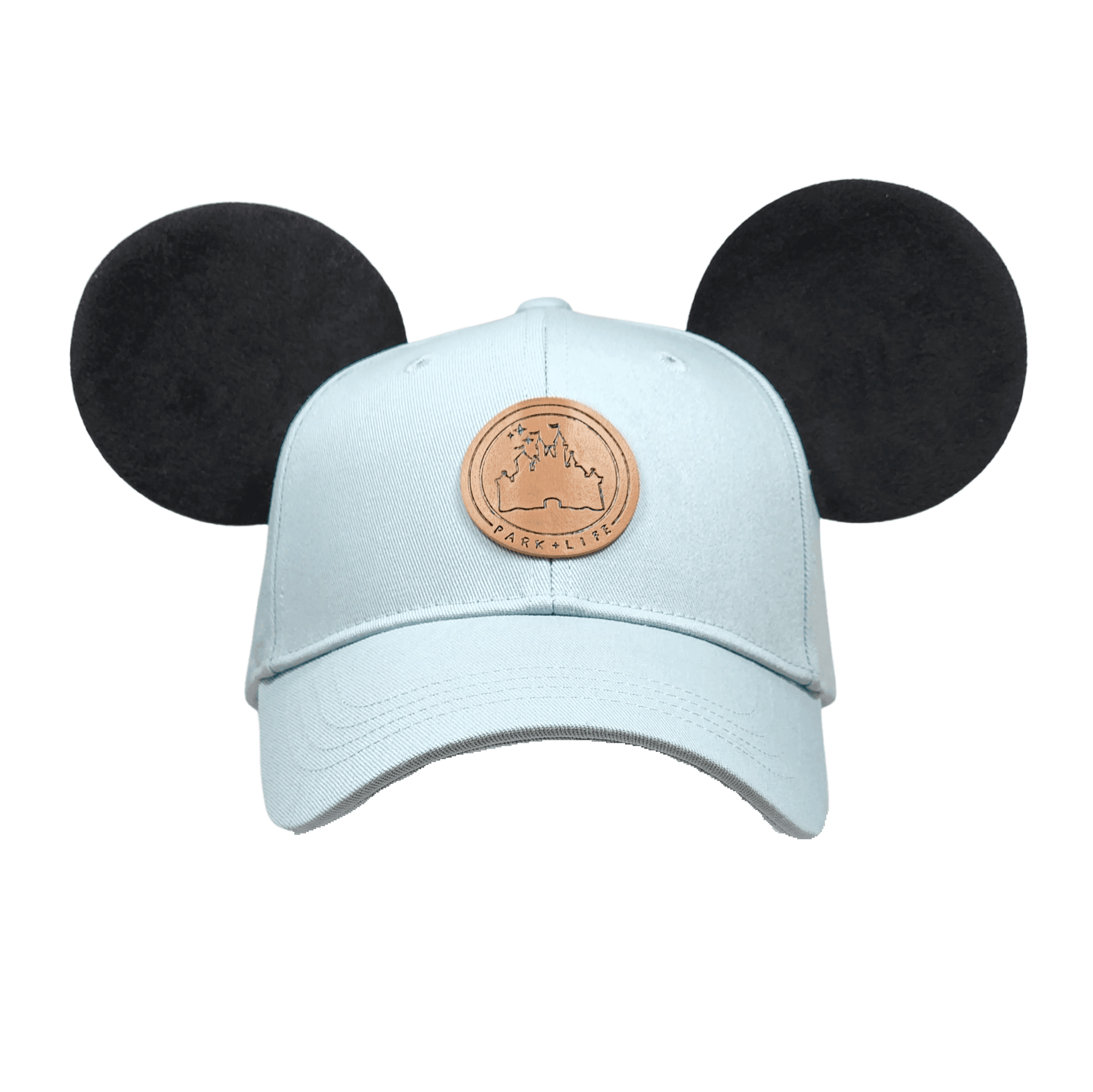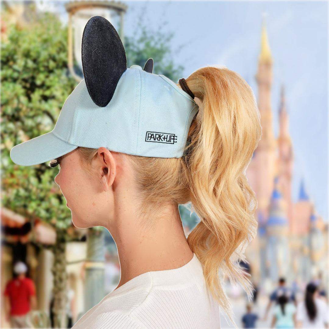 Our True Original high ponytail style mouse ear hat is perfect for a day spent in the Disney parks or out around town. This hat is made of 100% high quality cotton to be both lightweight and durable. It features a vegan leather "Park+Life" castle logo patch, and two premium black mouse ears made to stand up... even on the wildest rides!
